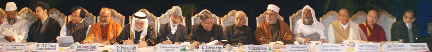 L-R: Prof M. Saud Alam Qasmi, Dean Faculty of Sunni Theology, AMU, Aligarh; Prof. Syed Ali Mohammad Naqvi, Dean, Faculty of Shia Theology, AMU, Aligarh; Dr. M.D. Thomas, National Director, Commission for Religious Harmony, C.B.C.I. New Delhi; Swami Sarwanand Saraswati, Mahashakti Peeth, New Delhi; Dr. Mustafa Sairfi, Visiting Professor, Doha, Qatar; Dr. Mohammad Manzoor Alam, Chairman, IOS; Mr. K. Rahman Khan, Deputy Speaker, Rajya Sabha, New Delhi; Prof. Sibghatullah Farooqui, Vice-Chancellor, Aligarh Muslim University, Aligarh; Shaikh Gamaluddin Kotb, Chairman, Fatwa Committee, Al-Azhar University, Eygypt; Maulana Khalid Saifullah Rahmani, General Secretary, Islamic Fiqh Academy (India); Swami Dharmananda, Director, Adhyatma Sadhna Kendra, New Delhi; Mr. Geshe Dorji Damdul, Director, Tibbat House, New Delhi; Prof. Mohammed Muquim, former Head, Deptt. of Philosphy, AMU, Aligarh and Coordinator, IOS Aligarh Chapter